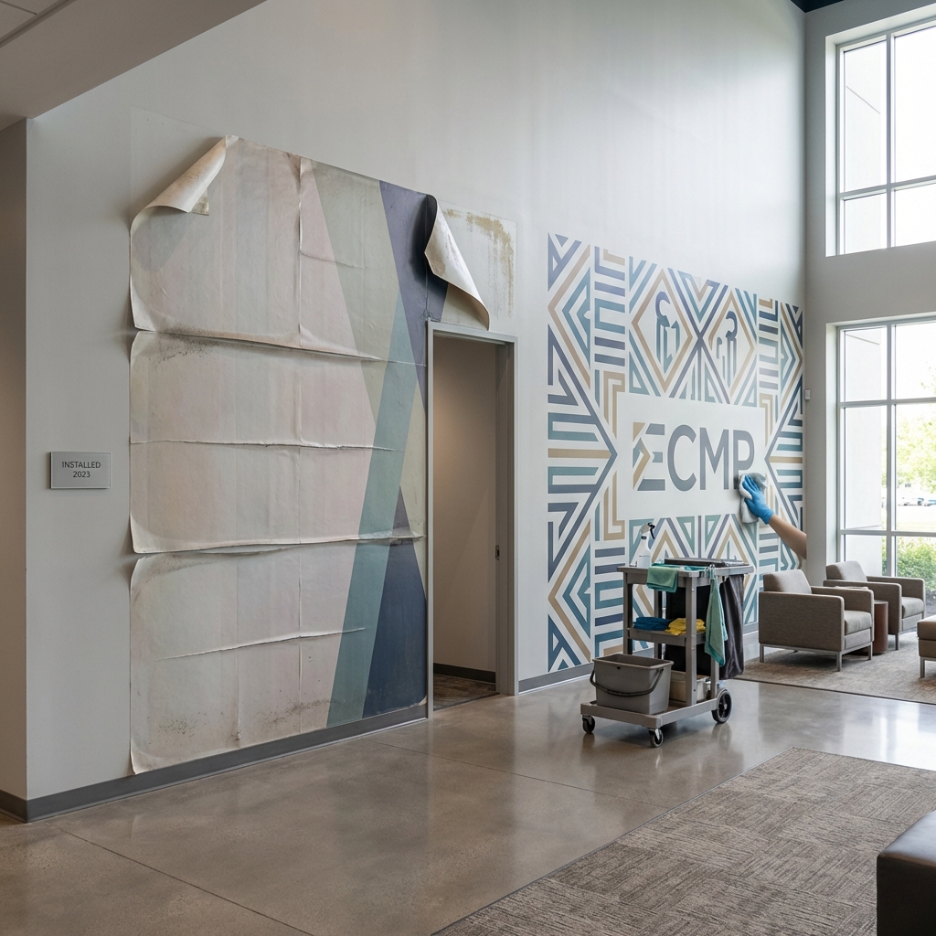 And then there’s the refresh problem. When your brand evolves or a lease-up period demands a wall update, removing vinyl is destructive. Adhesive residue requires chemical strippers or grinding, damaging paint and substrate. Full wall repainting often follows. Your one-wall update becomes a multi-day project with disposal costs and surface repair.